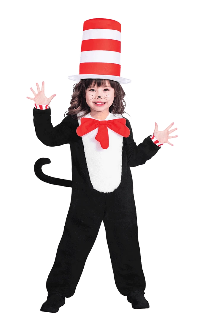 The Children’s Cat in the Hat Costume comes with an all-in-one black furry jumpsuit, with a white furry belly and an attached bow tie and tail. Completing the look is the iconic red and white striped top hat to fully transform your child into this delightful childhood character.