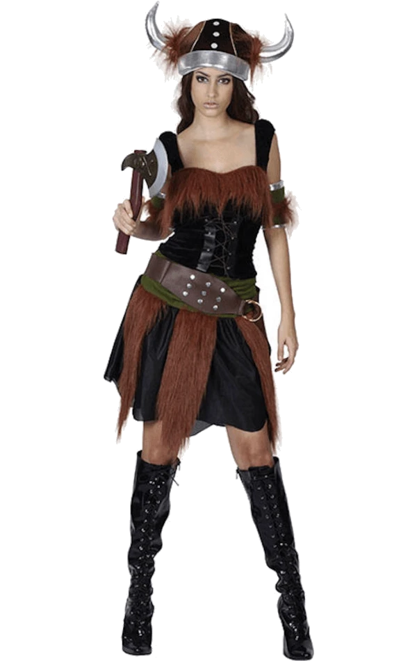 Become a Norse seafarer in the Adult Viking Lady Costume! The costume includes a brown and black outfit with dress, belt, arms cuffs and Viking hat.