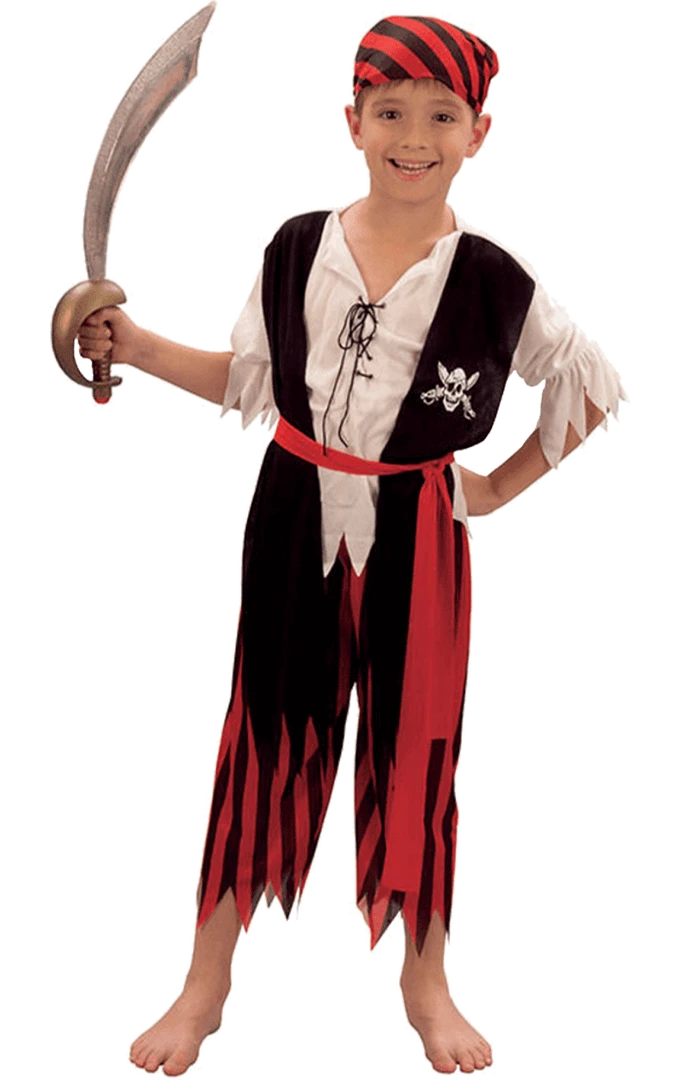 Jump on board the boat in the Child Pirate Boy Jim Costume! The costume includes a black and white top with lace-up front, striped trousers with waist sash and headscarf.