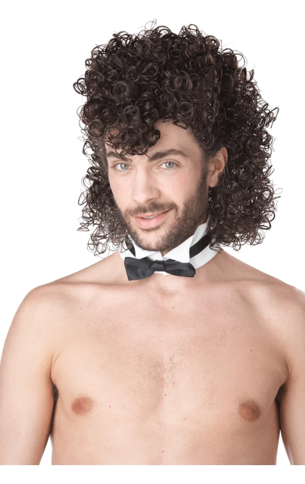 Become a star stripper with this super-hot permed mullet style wig. The Male Stripper Brown Wig set also includes a white collar with black bow tie to complete the outfit. Now you have everything you need for the fantastic comedy fancy dress costume!