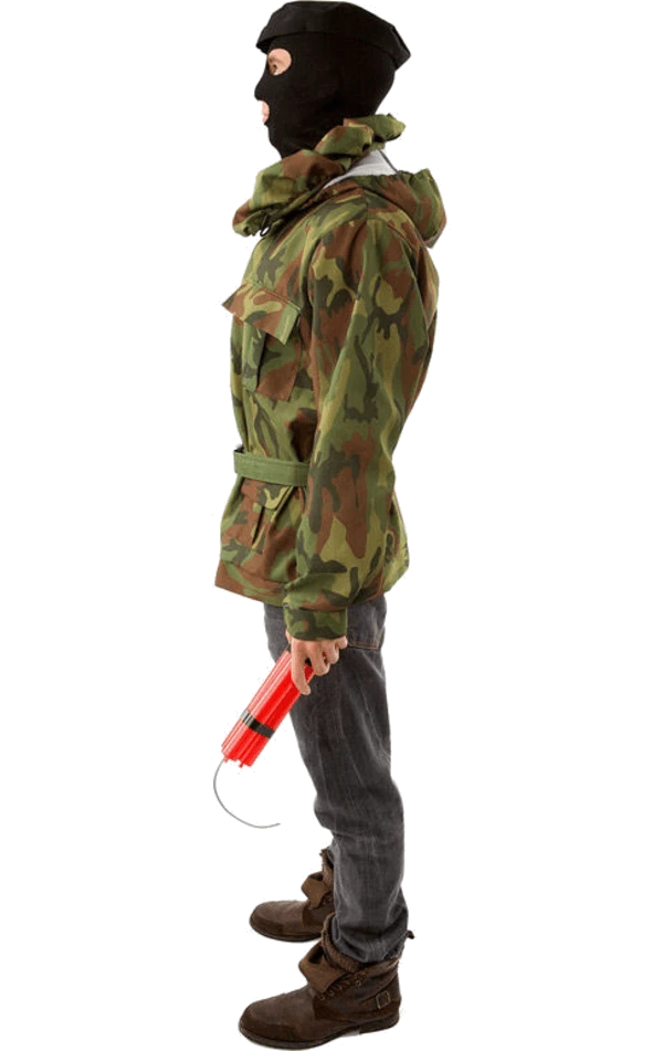 Costume includes camouflage printed jacket with hood as well as a matching inflatable camouflage gun!