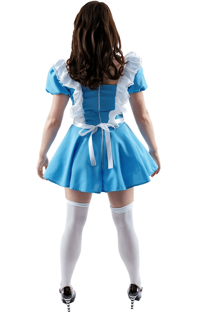 Twist an old story with the Adult Sexy Alice Dress! This blue dress is short and comes with an inbuilt white apron and bow detail.