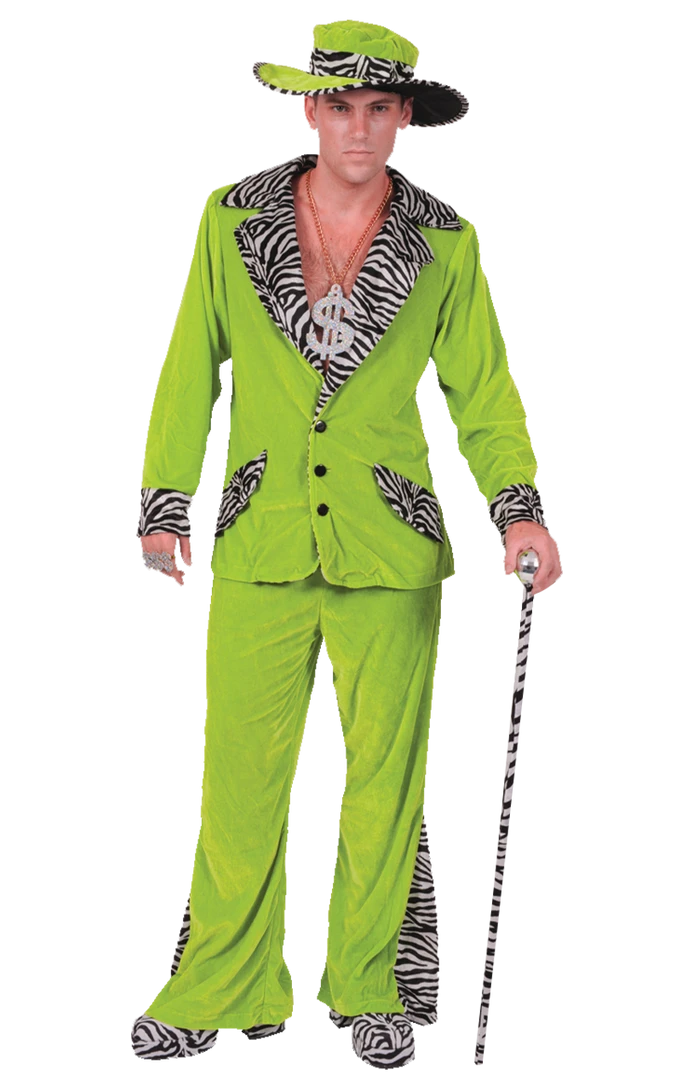 Our Adult Green Pimp Costume comes complete with a long sleeve bright green jacket with zebra prints on the collar, pockets and sleeves. It also features a matching pair of trousers with the same animal print on the bottom of the trouser leg. The final touch to add your pimp outfit is our fabulous, and slightly over the top, matching red hat.