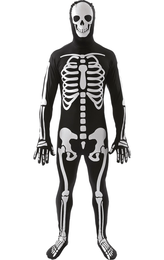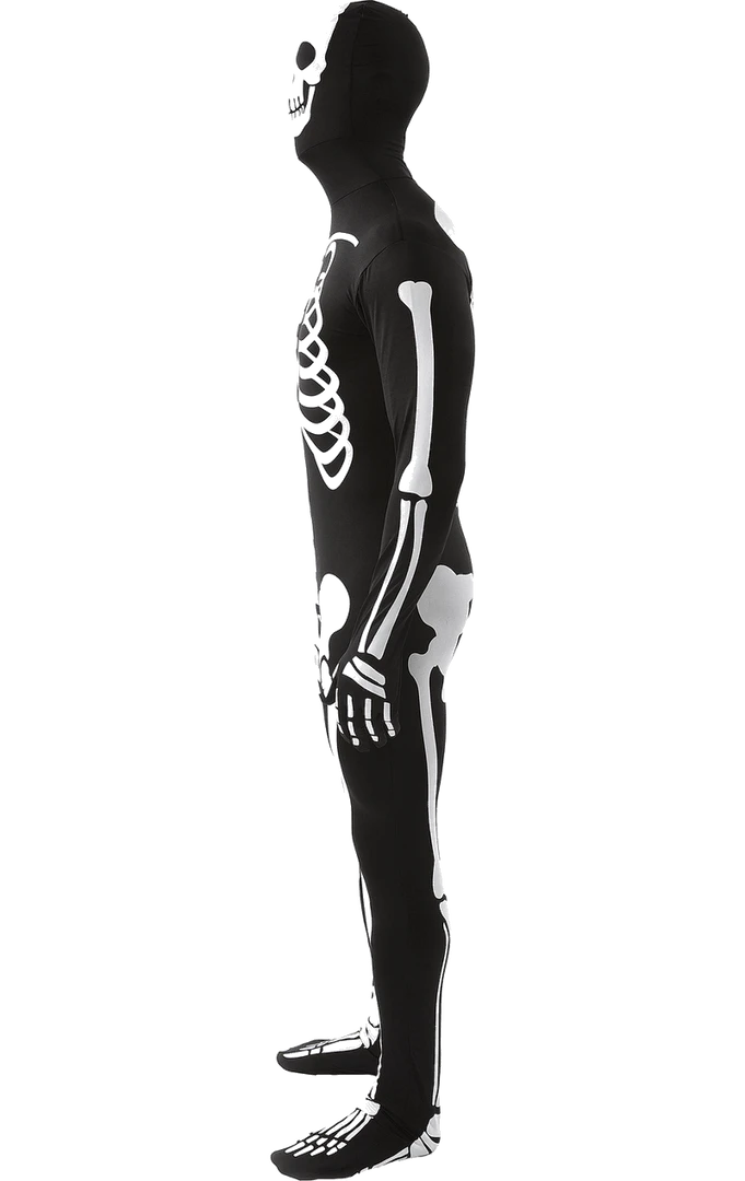Show off your bones this Halloween with the Adult Second Skin Skeleton Suit! This second skin suit is black and comes with a hood and white skeleton print.
