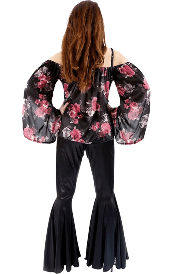 Show off your retro style with the Adult 70s Groovy Disco Lady Costume! The costume includes a flower print off the shoulder top and black flared disco trousers.