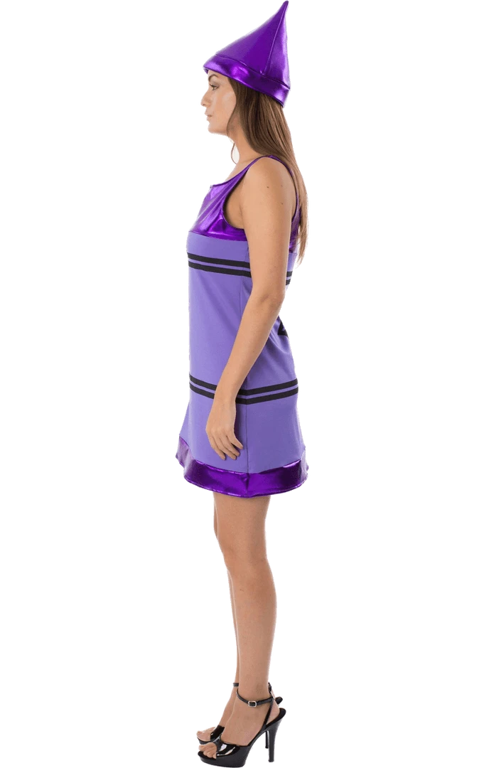 Play with nostalgia with the Women’s Purple Crayon Costume! This costume includes a short purple dress with gold piping and hat.