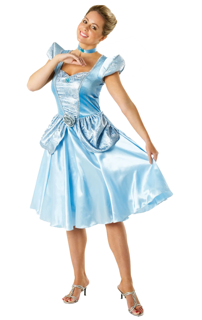 This gorgeous Cinderella costume includes a mid-length light blue dress with a jewel on the chest, glittery puff sleeves, and a satin peplum with a fabric rose at the front.