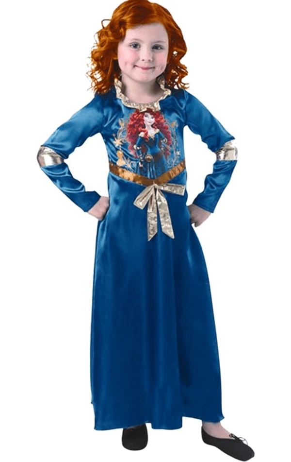 This beautiful Princess Merida outfit includes a dark blue and gold long dress with character print on the chest and will turn every young lady into a truly charming Disney princess. The front of the dress is also decorated with a gold trim and a golden bow on the front.