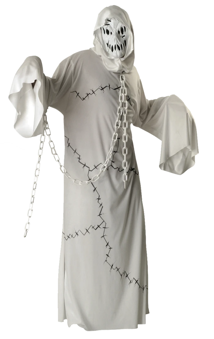 Want to be ghoulish, ghastly and ghostly? Slip into the Adult Cool Ghoul Costume! The costume comes with a long white hooded robe with black stitching design, chains and mask.