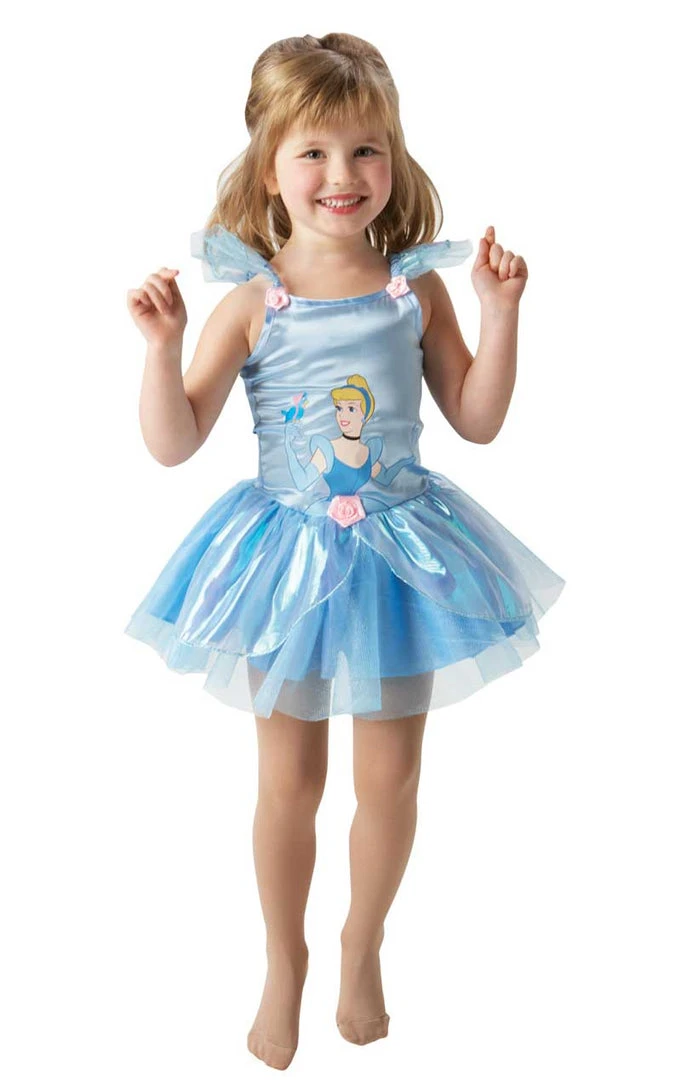 The kid’s Cinderella Ballerina costume includes a short baby blue ballerina dress with pink floral decorations. It features a picture of Cinderella holding a little bird printed on the front.