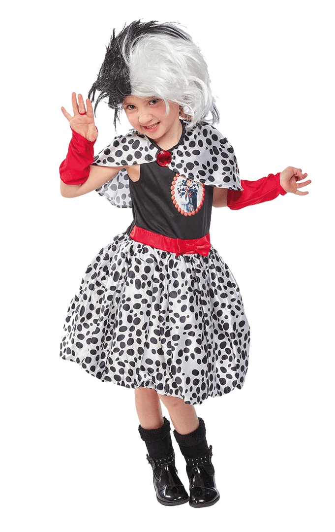 The skirt section of the dress is white with black polka dots, giving it a cute 90’s look. The bodice of the dress is plain black with a large circular image of Cruella De Vil on the front. The costume is completed with a black and white spotted satin cape.