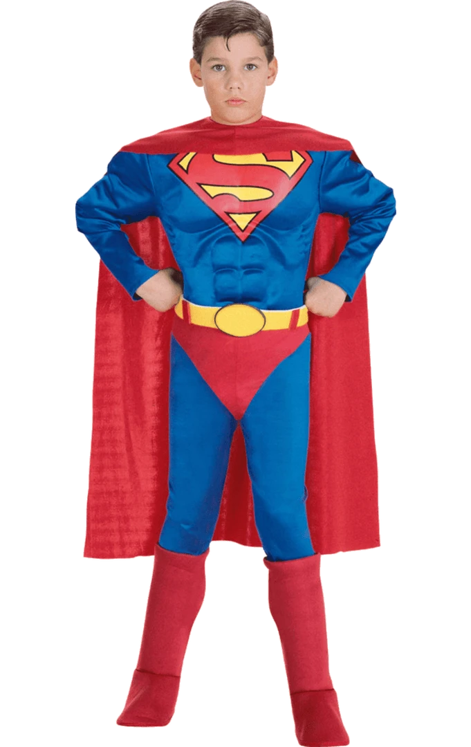 The Children’s Muscle Chest Superman Superhero Costume includes an all-in-one jumpsuit in blue and red. It also features a muscle chest with the famous Superman logo printed on top.
