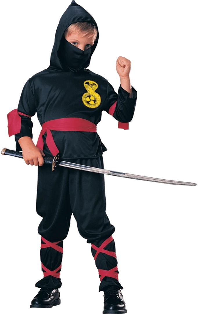 This fantastic value costume includes a black hooded long-sleeved top with yellow snake detailing, matching black trousers, a black face scarf and five red ribbons to tie around your arms, waist and legs for the ultimate warrior look.