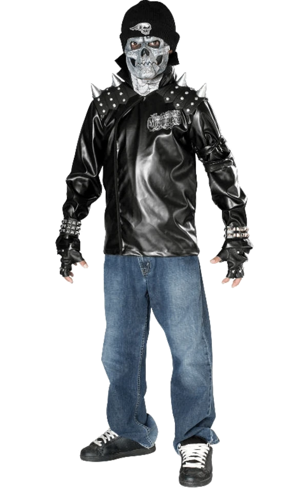 This child metal skull biker costume includes a jacket style t-shirt with attached shoulder pieces, a vinyl mask with attached cap and studded gloves. This Halloween costume is ideal for horror themed parties, and great accompanied with biker accessories.