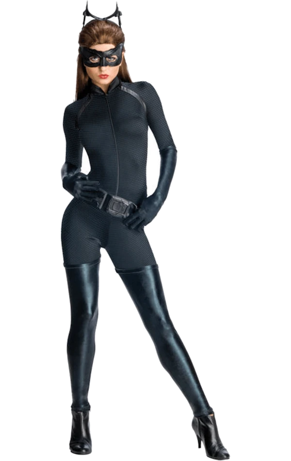 Turn superhero heads in the licensed Adult The Dark Knight Rises Sexy Catwoman Costume! The costume includes a black jumpsuit, boot tops, eyemask, gloves and moulded belt.