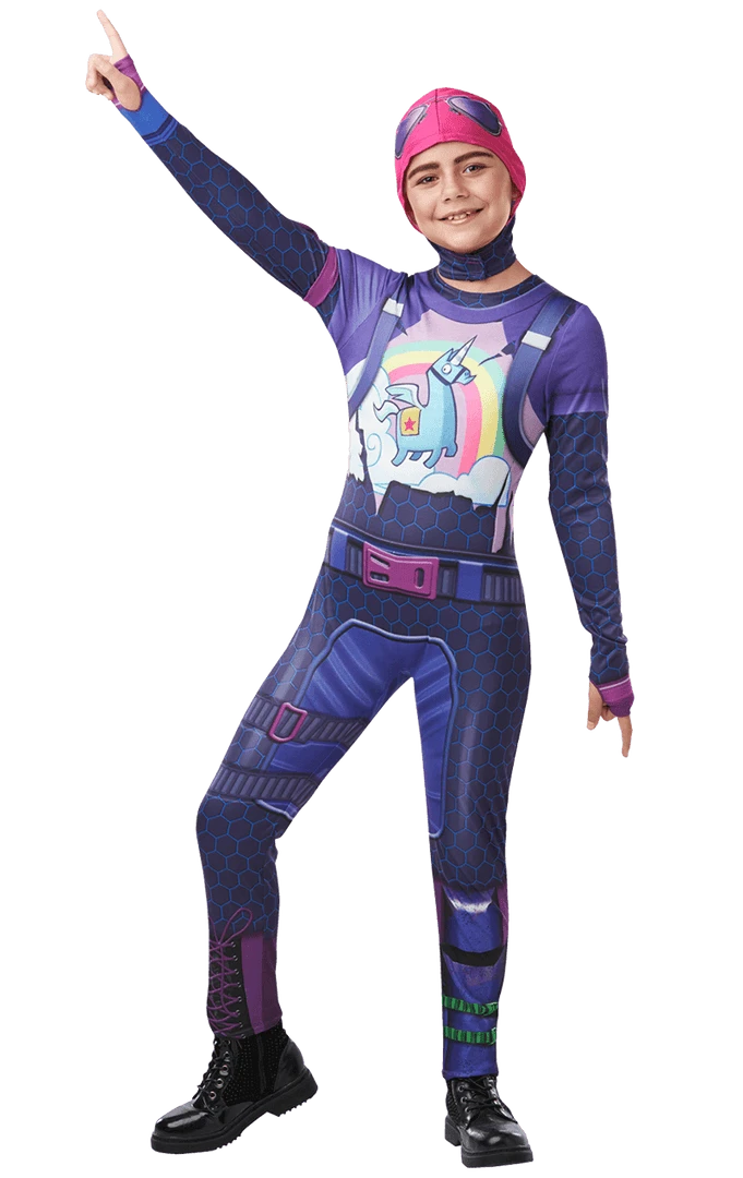 For true Fortnite fans, this Tween Brite Bomber Costume will transform your gamer girl into her favourite character! This deluxe version includes the purple printed jumpsuit with armband, a matching snood, and a Chug Jug Drink Holder.