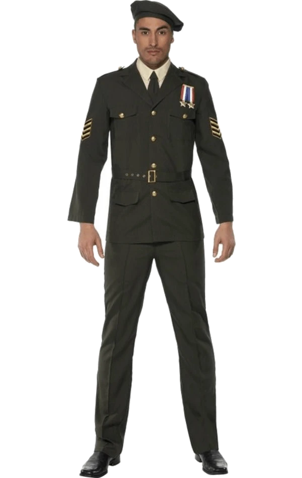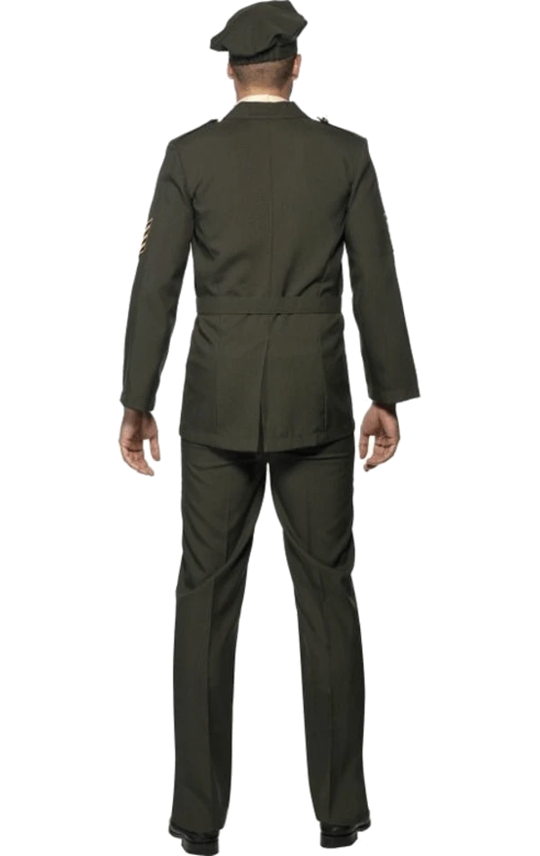 The Adult Wartime Officer Army Costume includes trousers, hat, belt and jacket with tie.