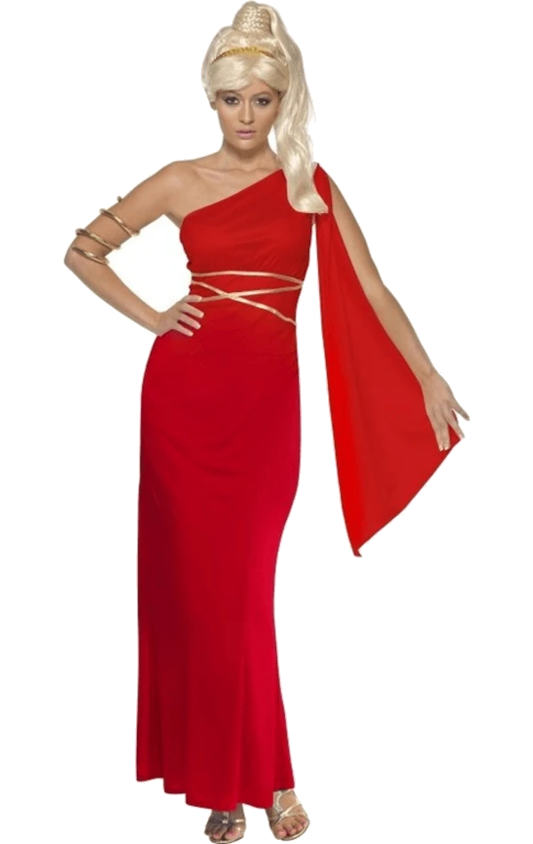 Become the goddess of love with the Adult Aphrodite Costume! The costume includes a long one shoulder red dress with gold detailing and headpiece.