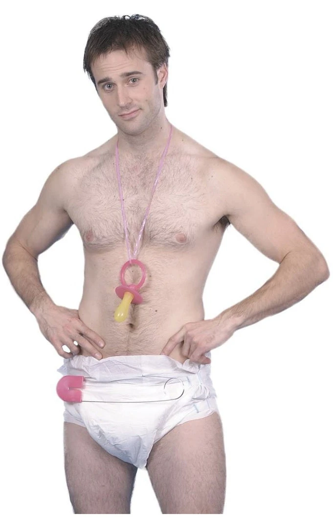 Start rocking the party crib with the Adult Baby Kit! The costume comes complete with white jumbo nappy with in built pink safety pin and a dummy with neck cord.