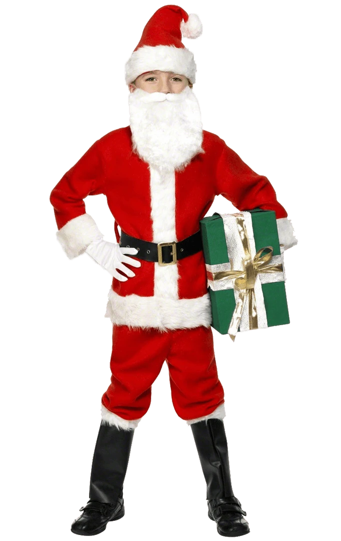 Get those presents ready in the high quality Child Deluxe Santa Costume! The costume includes a red jacket with white fur, matching trousers, hat, belt, gloves, boot covers and beard.