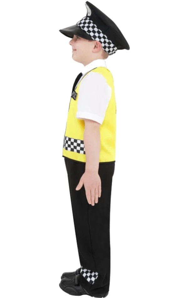 Command the party with the Child Police Boy Costume! The costume includes black trousers with white square design, yellow top with faux shirt, hat and toy radio set.