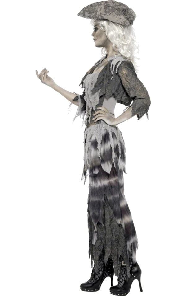 Be captain of the ghost ship in the Adult Ghost Ship Ghoulina Costume! This costume includes a tattered grey skirt, matching top, jacket and hat.