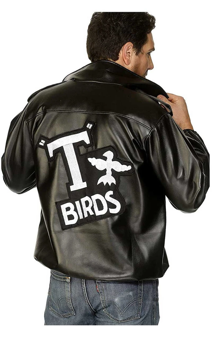 The leather-look jacket in black features a T Birds sew-on patch on the back and standing collar, to give you the cool dude look. Please note, the jacket doesn’t guarantee cool dude dance moves.